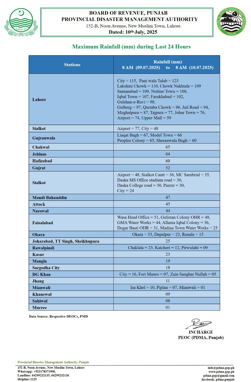 ڈی جی پی ڈی ایم اے عرفان علی کاٹھیا کا کہنا ہے کہ ہنگامی صورتحال سے نمٹنے کے لیے متعلقہ محکمے الرٹ رہیں صوبائی کنٹرول روم سمیت تمام اضلاع کے ڈسٹرکٹ ایمرجنسی آپریشن سنٹرز کو بھی الرٹ ہیں۔پی ڈی ایم اے کنٹرول روم میں صورتحال کی مانیٹرنگ 24/7 جاری ہے۔1122 اور واسا سمیت دیگر ریسکیو ادارے مشینری سمیت عملے کو الرٹ رکھیں۔ڈی جی نے ہدایت کی ہے کہ نشینی علاقوں سے پانی کی نکاسی کو جلد از جلد ممکن بنائیں چوکنگ پوائنٹس پر جمع پانی کی نکاسی کو یقینی بنایا جائے مون سون بارشوں کا یہ سلسلہ 13جولائی تک جاری رہنے کی پیشگوئی ہے شہری احتیاط کریں بجلی کے کھمبوں اور لٹکتی تاروں سے دور رہیں۔شہری کچے مکانات اور بوسیدہ عمارتوں سے دور رہیں۔بچوں کا خاص خیال رکھیں انہیں نشیبی علاقوں میں جمع پانی کے قریب ہرگز نہ جانے دی۔شہری مدد کیلئے پی ڈی ایم اے کی ہیلپ لائن 1129 پر کال کر سکتے ہیں۔
