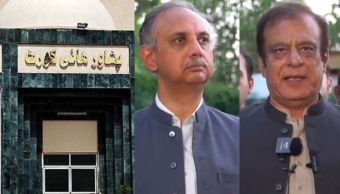پشاور ہائیکورٹ کے جسٹس ارشد علی اور جسٹس خورشید اقبال پر مشتمل 2 رکنی بینچ نے عمر ایوب اور شبلی فراز کو الیکشن کمیشن کی جانب سے ڈی نوٹی فائی کرنے کے خلاف درخواست پر سماعت کی۔