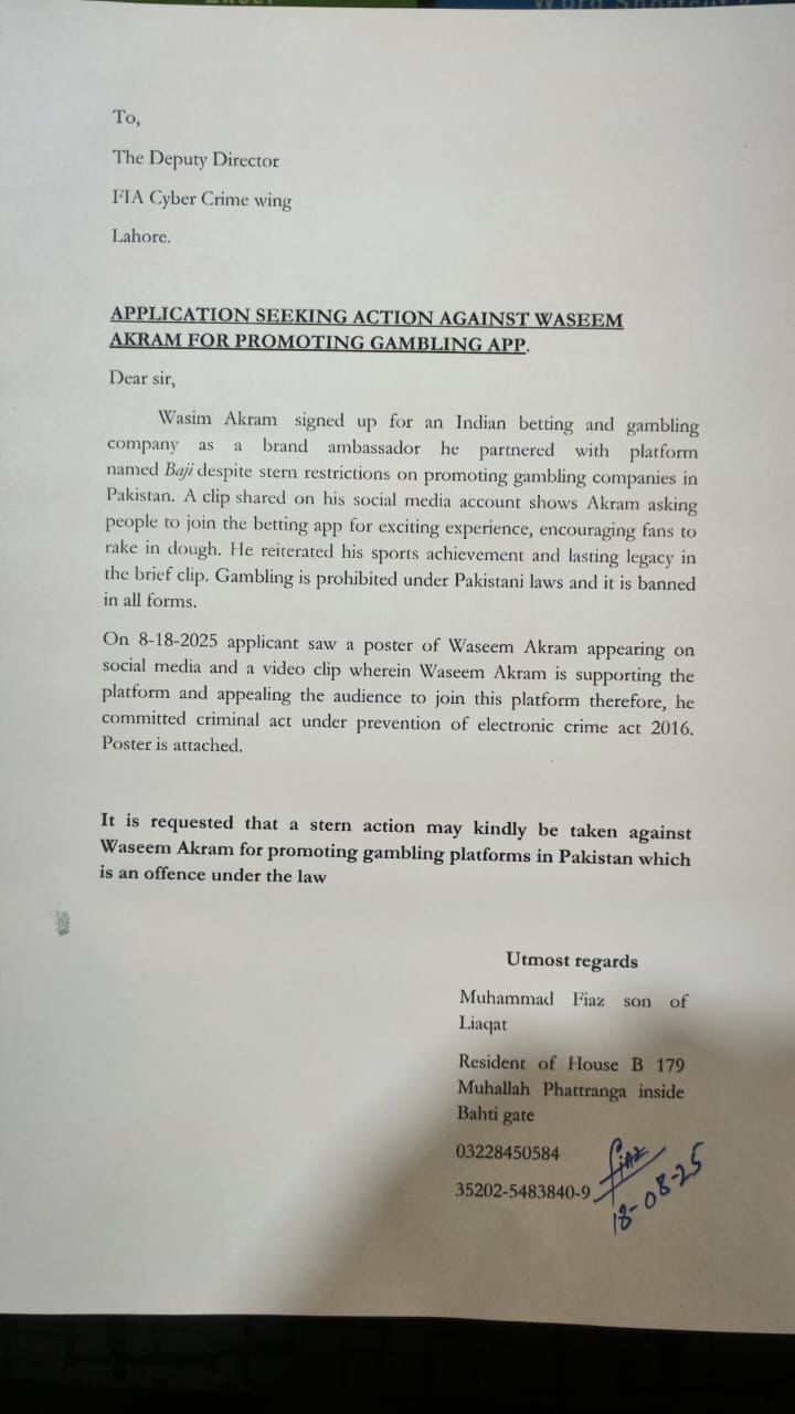 سابق کپتان وسیم اکرم پر جوئے کی تشہیر کرنے کے الزام پر کارروائی کےلیے ایف آئی اے سائبر کرائم ونگ میں درخواست جمع کروائی دی