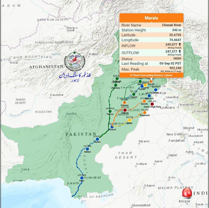 پی ڈی ایم اے پنجاب کے مطابق دریائے راوی میں ہیڈ سدھنائی کے مقام پر انتہائی اونچے درجے کا سیلاب ہے۔