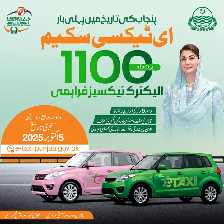 پنجاب میں پہلی ای ٹیکسی سکیم کا باقاعدہ آغاز پہلے مرحلے میں 1100 الیکٹرک گاڑیاں سکیم کیلئے مختص کردی گئی۔