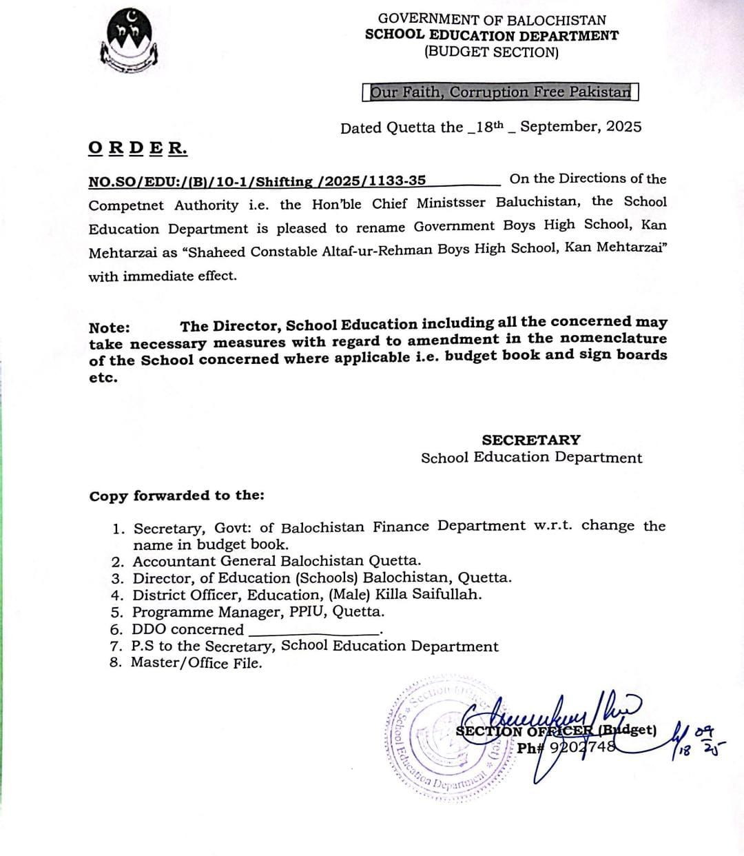 حکومت بلوچستان نے فورسز کے شہداء کی لازوال قربانیوں کو خراجِ عقیدت پیش کرنے کے لیے صوبے کے دو اہم تعلیمی اداروں کے نام شہداء کے ناموں سے منسوب کر دیے۔ اس سلسلے میں باقاعدہ نوٹیفکیشن جاری کر دیا گیا ہے۔