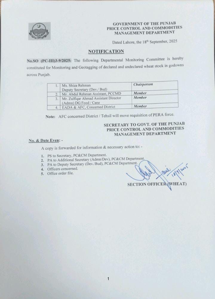 محکمہ پرائس کنٹرول اینڈ کماڈیٹیز مینجمنٹ کا بڑا اقدام صوبہ بھر کے گوداموں میں گندم ذخائر کی پہلی بار فزیکل ویری فکیشن اور جیو ٹیگنگ کا آغاز