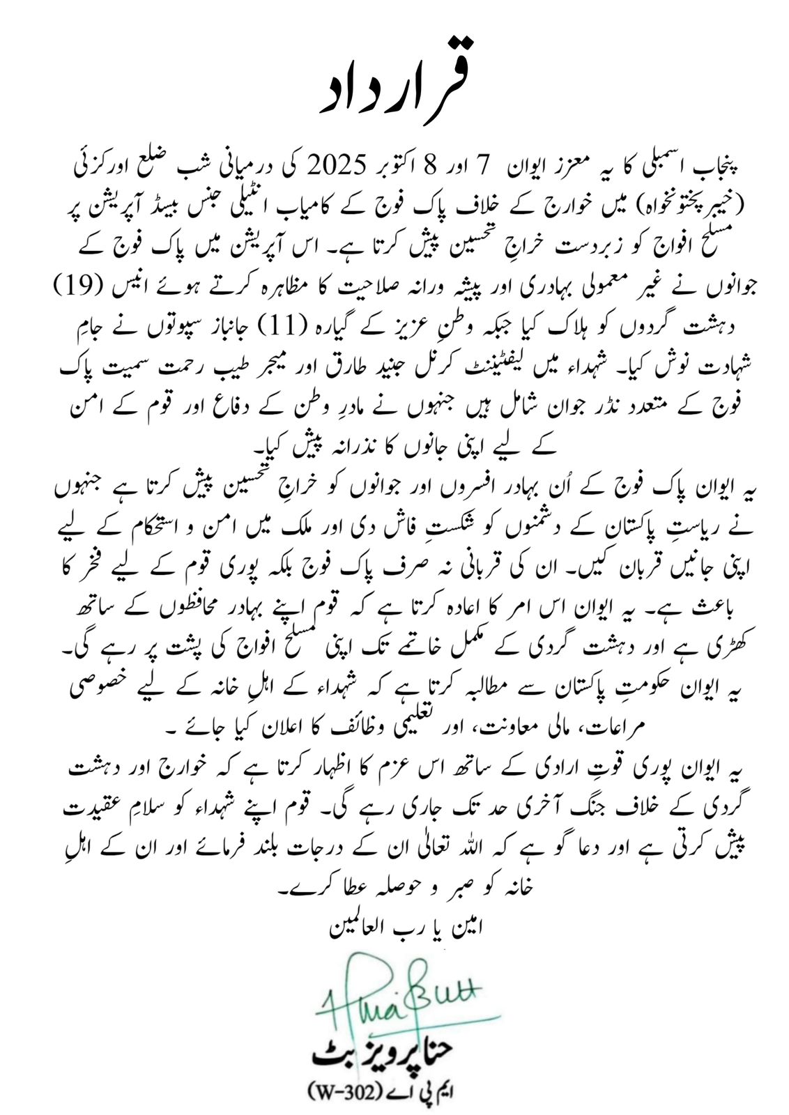 لاہور: ضلع اورکزئی میں پاک فوج کے کامیاب انٹیلی جنس بیسڈ آپریشن پر خراجِ تحسین کی قرارداد پنجاب اسمبلی میں جمع کرائی گئی۔