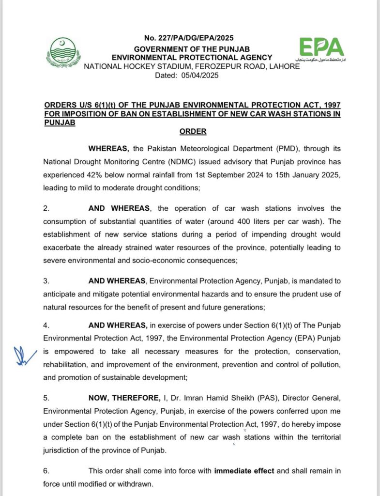 پنجاب حکومت نے صوبے بھر میں نئے کار واش اسٹیشنز پر پابندی عائد کردی۔ پنجاب میں پانی کی قلت اور ممکنہ خشک سالی کے پیش نظر فیصلہ کیا گیا محکمہ ماحولیات کے ڈی جی نے پنجاب ماحولیاتی تحفظ ایکٹ کے تحت پابندی کا نوٹیفیکشن جاری کردیا۔ نوٹیفیکشن کے مطابق پنجاب میں نئے کار سروس اسٹیشن بنانے پر مکمل پابندی ہوگی۔پابندی کی خلاف ورزی پر پاکستان پینل کوڈ کے تحت کاروائی ہوگی۔نئے کار واش اسٹیشن بنانے پر پابندی کا عملدآمد فوری ہوگا۔ محکمہ تحفظ ماحولیات کے مطابق پنجاب میں پانی کی قلت، ممکنہ خشک سالی کے پیش نظر فیصلہ کیا گیا۔ایک گاڑی دھونے پر چار سو لیٹر پانی ضائع ہوجاتا ہے۔نئے سروس اسٹیشن خشک سالی کو مزید سنگین کرکے ماحولیاتی اور سماجی اقتصادی مشکلات کا باعث بنیں گے