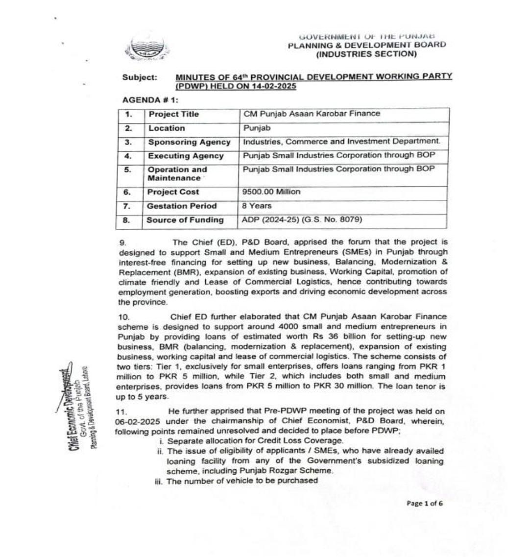 چیف منسٹرآسان کاروبار فنانس منصوبے میں ترمیم کر دی گئی قرض کی دیگراسکیموں سے مستفید ہونیوالے افراد بھی اب آسان کاروبارپراجیکٹ سےقرضہ لے سکیں گے قرض دینے کا حتمی فیصلہ پنجاب بینک درخواست دہندہ کی مالی حیثیت دیکھ کر کرے گا9 ارب 50 کروڑ روپے سے چیف منسٹر پنجاب آسان کاروبار فنانس پراجیکٹ مکمل کیا جائے گامنصوبے کی لاگت مستقبل میں100 ارب کر دی جائے گی،دستاویزات کے مطابق پانچ سال میں قرض واپس کرنا ہوگا،نئے کاروبار کو چھ ماہ اور پرانے کاروبار کو تین ماہ کی توسیع ملے گی پنجاب حکومت 30 جون تک 9 ارب 10 کروڑ روپے تقسیم کرے گی،قرض کی واپسی کی قسط ہر ماہ کی یکم تاریخ ہوگی تاخیر پر ایک ہزار روپے یومیہ جرمانہ ہوگا،چھوٹے کاروبار کیلئے 2 ارب اور بڑے کاروبار کیلئے پنجاب حکومت 7 ارب 17 کروڑ 70 لاکھ خرچ کرے گی۔
