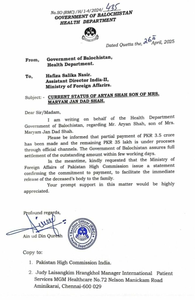 وزیراعلیٰ بلوچستان میر سرفراز بگٹی نے بھارت میں زیرعلاج وفات پا جانے والےبچے آریان کی والدہ کی اپیل کا نوٹس لے لیا۔ ترجمان صوبائی حکومت شاہد رند کے مطابق انڈین اسپتال کے تمام اخراجات حکومت بلوچستان نے ادا کردیے۔