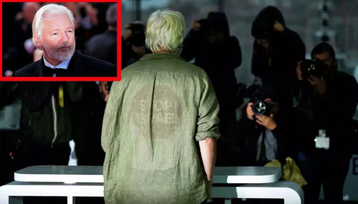 جولین اسانج کی ٹی شرٹ پر STOP ISRAEL کی عبارت بھی نمایاں تھی۔
