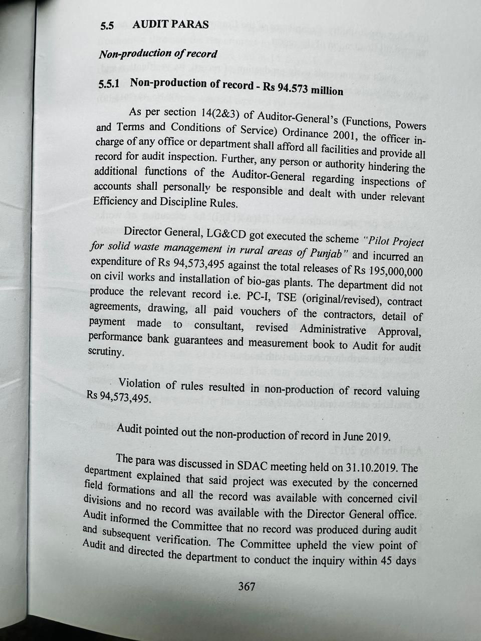 محکمہ بلدیات پنجاب میں 9 کروڑ 45 لاکھ روپے کی ریکارڈ کی عدم فراہمی کا انکشاف پنجاب اسمبلی میں جمع کرائی گئی مالی سال 2019 اور 2020 آڈٹ رپورٹ میں سالڈ ویسٹ مینجمنٹ منصوبے کے اخراجات کا ریکارڈ پیش نہ کیا گیا۔