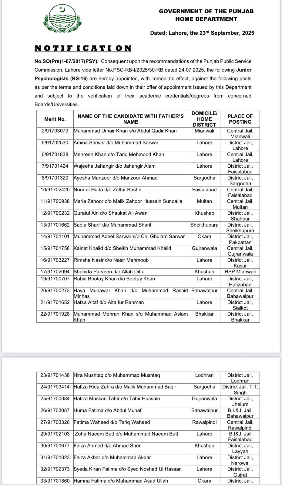 نوٹیفکیشن کے مطابق تعینات کیے گئے جونیئر سائیکالوجسٹس میں شامل ہیں: