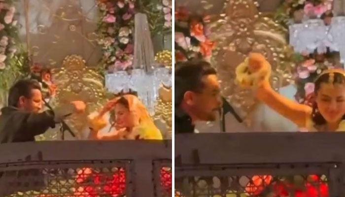 گزشتہ روز سوشل میڈیا پر ایک ویڈیو تیزی سے وائرل ہوئی جس میں ہانیہ عامر کو گلوکار عاصم اظہر کے ساتھ ڈانس کرتے دیکھا گیا۔ ویڈیو میں اداکارہ پیلے رنگ کے خوبصورت جوڑے میں ملبوس تھیں، ہاتھوں میں پھولوں کے گجرے جبکہ سر پر دوپٹہ اوڑھے دلہن جیسی تیاری کیے ہوئے نظر آئیں۔