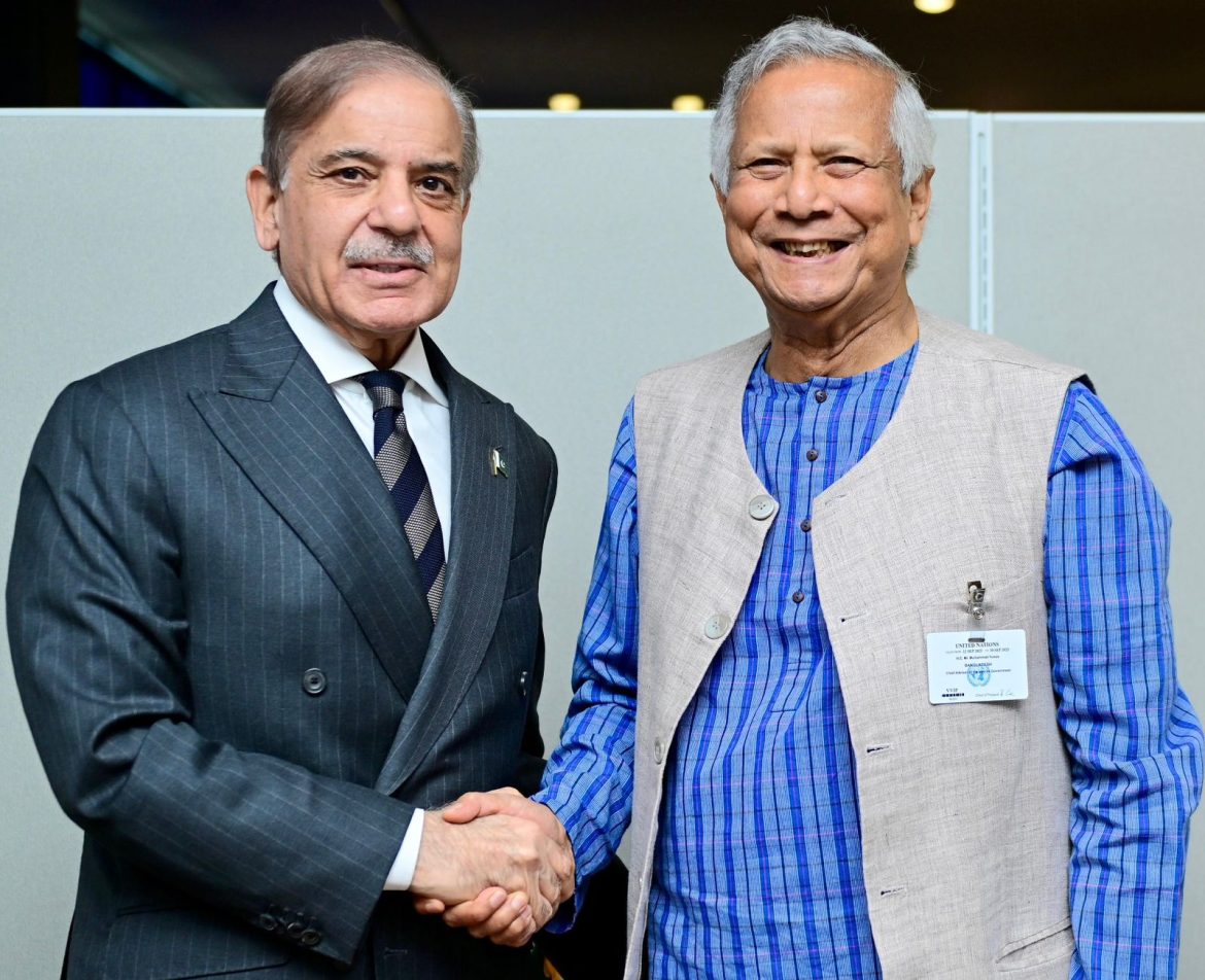 نیویارک: وزیراعظم پاکستان محمد شہباز شریف اور بنگلہ دیش کے چیف ایڈوائزر پروفیسر محمد یونس کے درمیان اقوام متحدہ جنرل اسمبلی (UNGA) کے 80 ویں اجلاس کی سائیڈ لائن پر اہم ملاقات ہوئی۔ یہ ملاقات خوشگوار اور گرم جوش ماحول میں ہوئی، جس میں دونوں رہنماؤں نے پاکستان اور بنگلہ دیش کے تعلقات کو مزید مستحکم کرنے کے عزم کا اظہار کیا۔