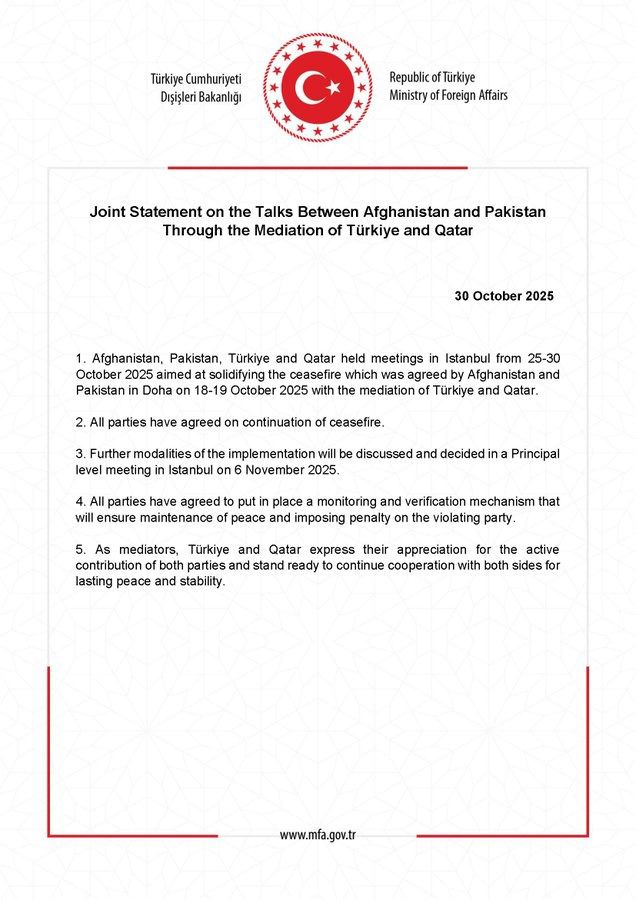 اعلامیے کے مطابق، ترکیہ اور قطر کی ثالثی میں پاکستان اور افغانستان کے درمیان 25 سے 30 اکتوبر تک استنبول میں مذاکرات منعقد ہوئے۔ یہ بات چیت 18 اور 19 اکتوبر کو دوحہ میں طے پانے والے جنگ بندی معاہدے کو مزید مضبوط بنانے کے لیے کی گئی۔