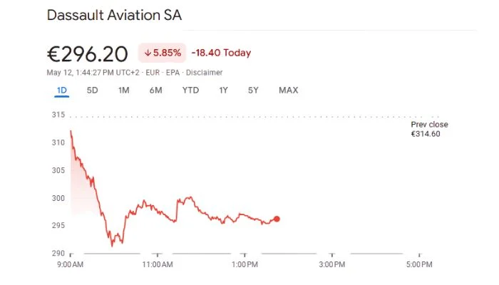 بھارتی فضائیہ کی جانب سے 6 اور 7 مئی کی درمیانی شب پاک فضائیہ کی جوابی کارروائی میں بھارتی طیارے گرنے کا بالواسطہ اعتراف کرنے بعد رافیل طیارے بنانے والی فرانسیسی کمپنی کے شیئرز مزید گرگئے۔