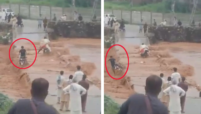 ریلے میں بہہ جانے والے نوجوان کی ویڈیو بھی سوشل میڈیا پر سامنے آئی جس میں دیکھا جاسکتا ہے کہ نالے پر بنائے گئے پُل سے لوگ اپنی گاڑیاں اور موٹرسائیکلیں گزار رہے ہیں۔