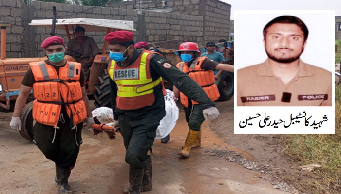 لاہور : جہلم میں بارش کے باعث آنے والے سیلاب میں امدادی سرگرمیوں میں شامل پولیس اہلکار حیدر علی پانی میں بہہ کر شہید ہو گیا۔