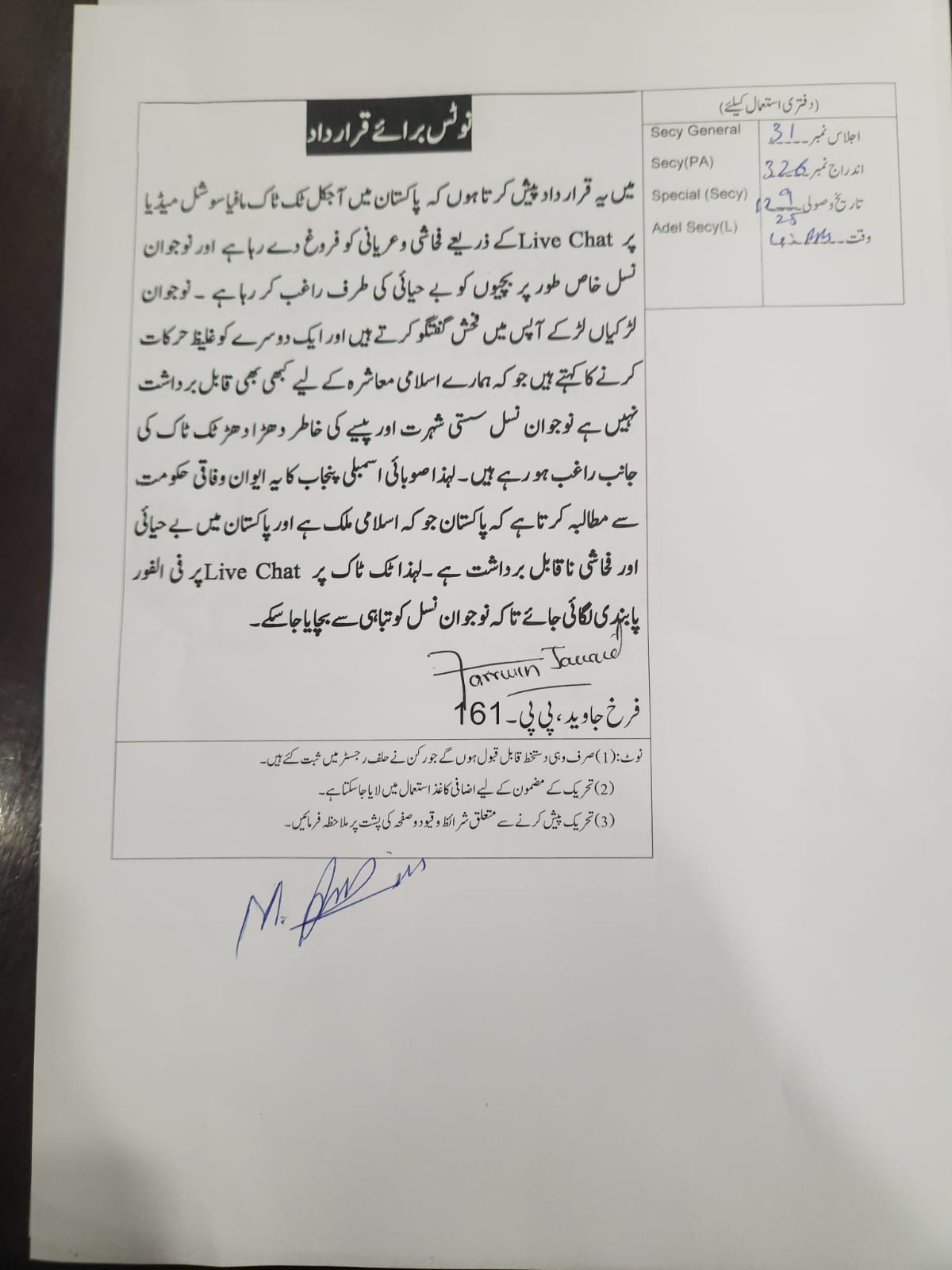 قرار داد کے متن میں کہا ہے کہ پاکستان میں آج کل ٹک ٹاک مافیا لائو چیٹ کے ذریعے فحاشی و عریانی کو فروغ دے رہا ہے،نوجوان نسل خاص طور پر بچوں کو بے حیائی کی طرف راغب کیا جا رہا ہے، نوجوان لڑکے لڑکیاں آپس میں فحش گفتگو کرتے ہیں،نوجوان لڑکے لڑکیاں ایک دوسرے کو غلط حرکات کرنے کا کہتے ہیں،یہ عمل ہمارے اسلامی معاشرے کے لئے کبھی بھی قابل برداشت نہیں،نوجوان نسل سستی شہرت اور پیسے کی خاطر دھڑا دھڑ ٹک ٹاک کی جانب راغب ہو رہے ہیں،صوبائی اسمبلی کا یہ ایوان وفاقی حکومت سے مطالبہ کرتا ہے کہ ٹک ٹاک پر لائو چیٹ پر فوری پابندی عائد کی جائے تاکہ نوجوان نسل کو تباہی سے بچایا جا سکے۔