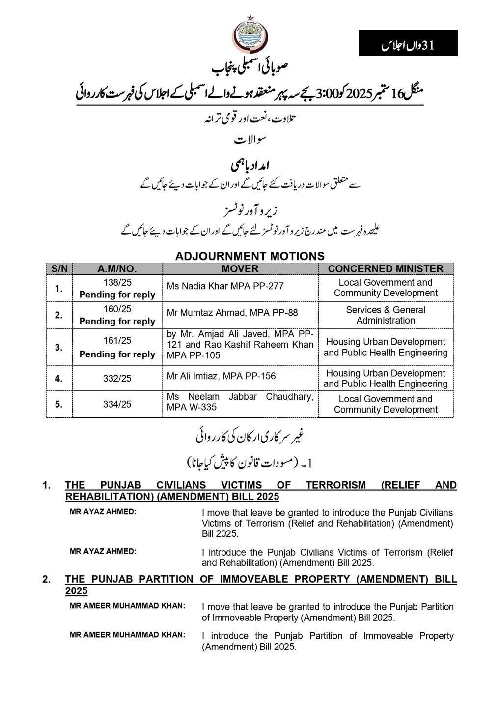 اجلاس میں محکمہ امداد باہمی پوچھے گئے سوالات کے جوابات دے گا،دوسری نشست میں ارکان اسمبلی زیرو آور نوٹسز پیش کریں گے،اجلاس میں 5 تحریک التواء کار زیر بحث آئیں گی،اجلاس میں ارکان اسمبلی 10 نئے مسودات قانون پیش کریں گے،دوسری نشست میں 6 مسودات قانون منظوری کے لئے پیش ہوں گے،ارکان اسمبلی آج 3 نئی قراردادیں پیش کریں گے،دوسری نشست میں 5 موجودہ قراردادیں زیر بحث آئیں گی،اجلاس میں ارکان اسمبلی اہمیت کے حامل معاملات اٹھائیں گے۔