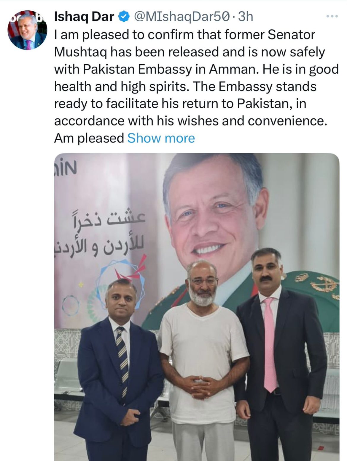 پاکستان کے نائب وزیراعظم و وزیر خارجہ اسحاق ڈار نے سماجی رابطے کی ویب سائٹ ایکس (سابق ٹوئٹر) پر جاری اپنے بیان میں سابق سینیٹر مشتاق احمد کی رہائی کی تصدیق کی۔ انہوں نے بتایا کہ مشتاق احمد اس وقت اردن میں پاکستانی سفارت خانے میں بحفاظت موجود ہیں۔