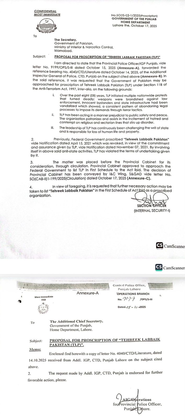ذرائع کے مطابق آئی جی پنجاب کی رپورٹ 15 اکتوبر 2025 کو بھجوائی گئی، جب کہ سی ٹی ڈی کی رپورٹ 14 اکتوبر 2025 کو تیار کی گئی۔ دونوں رپورٹس میں ٹی ایل پی کی سرگرمیوں کو “پبلک سیفٹی کے لیے خطرہ” قرار دیا گیا ہے۔