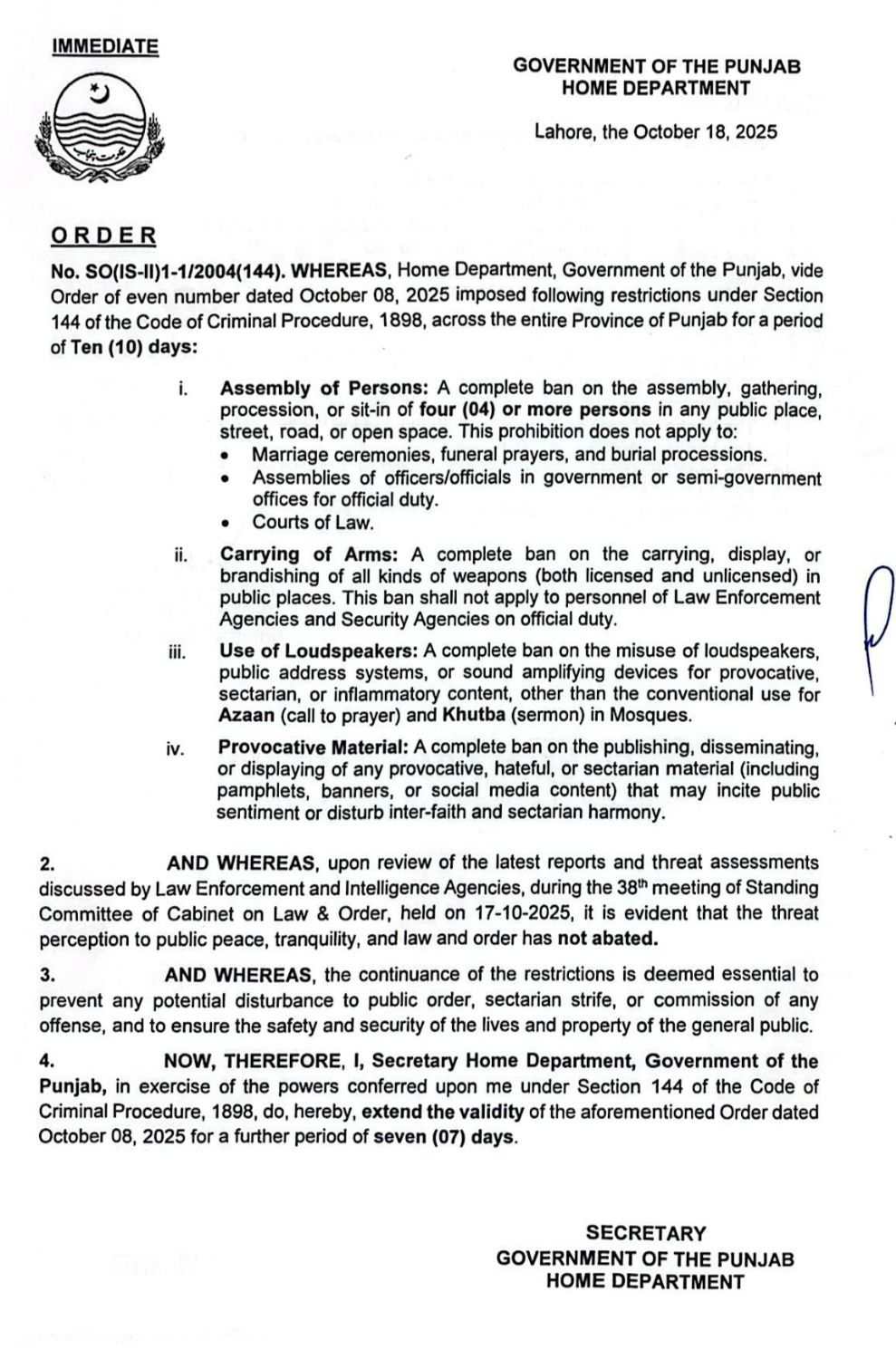 محکمہ داخلہ پنجاب نے جمعہ 24 اکتوبر 2025 تک دفعہ 144 کے نفاذ میں توسیع کا نوٹیفکیشن جاری کر دیا ہے اور متعلقہ اداروں کو عوامی آگاہی کے لیے دفعہ 144 کی بڑے پیمانے پر تشہیر کی ہدایت دی ہے۔