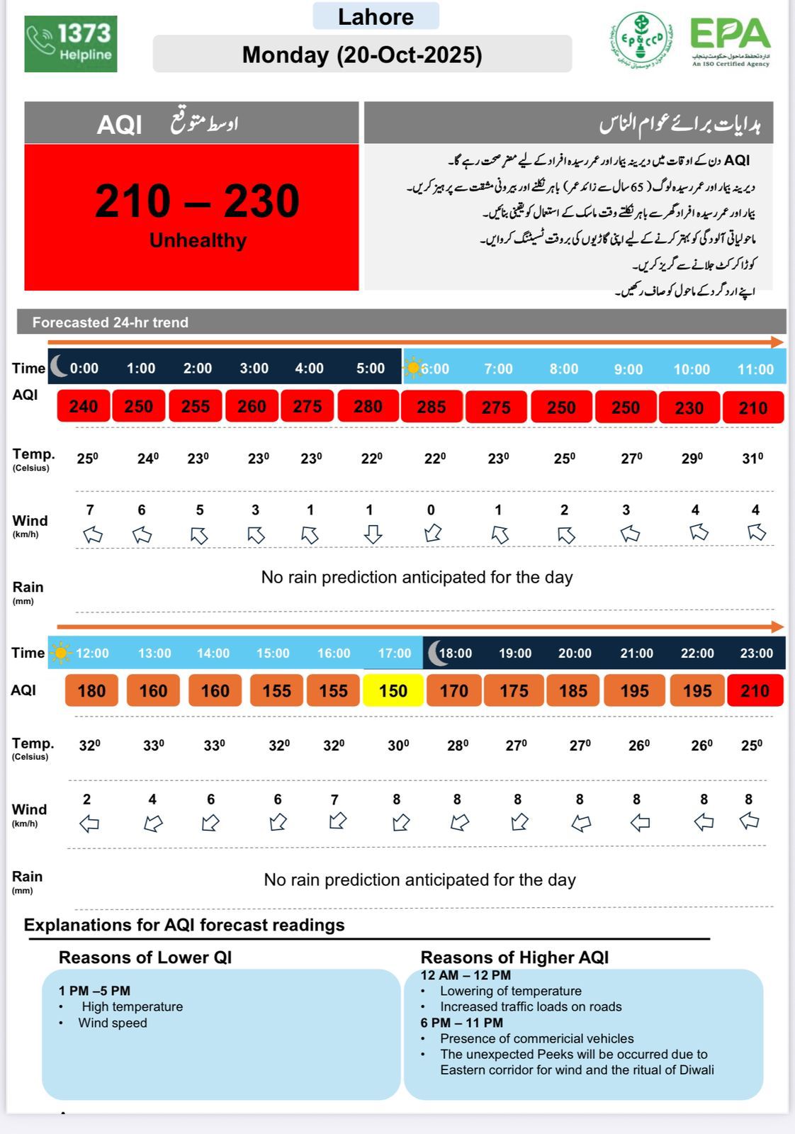 ہوا کی رفتار 1 سے 8 کلومیٹر فی گھنٹہ رہنے اور بارش نہ ہونے کے باعث آلودہ ذرات فضا میں معلق رہیں گے۔