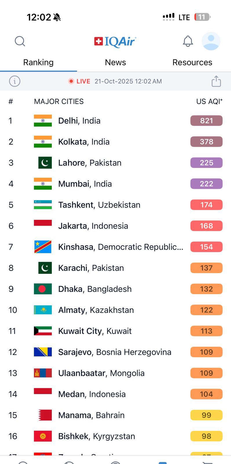 لاہور: بھارت کے دارالحکومت نئی دہلی میں دیوالی کی تقریبات کے بعد فضائی آلودگی خطرناک حد 821 تک پہنچ گئی ہے، جبکہ لاہور میں اس وقت اے کیو آئی 221 ریکارڈ کیا گیا ہے۔ ماہرین کے مطابق نئی دہلی کی آلودگی سے کل لاہور سمیت پنجاب کے دیگر شہروں میں دھند اور سموگ میں اضافہ متوقع ہے۔