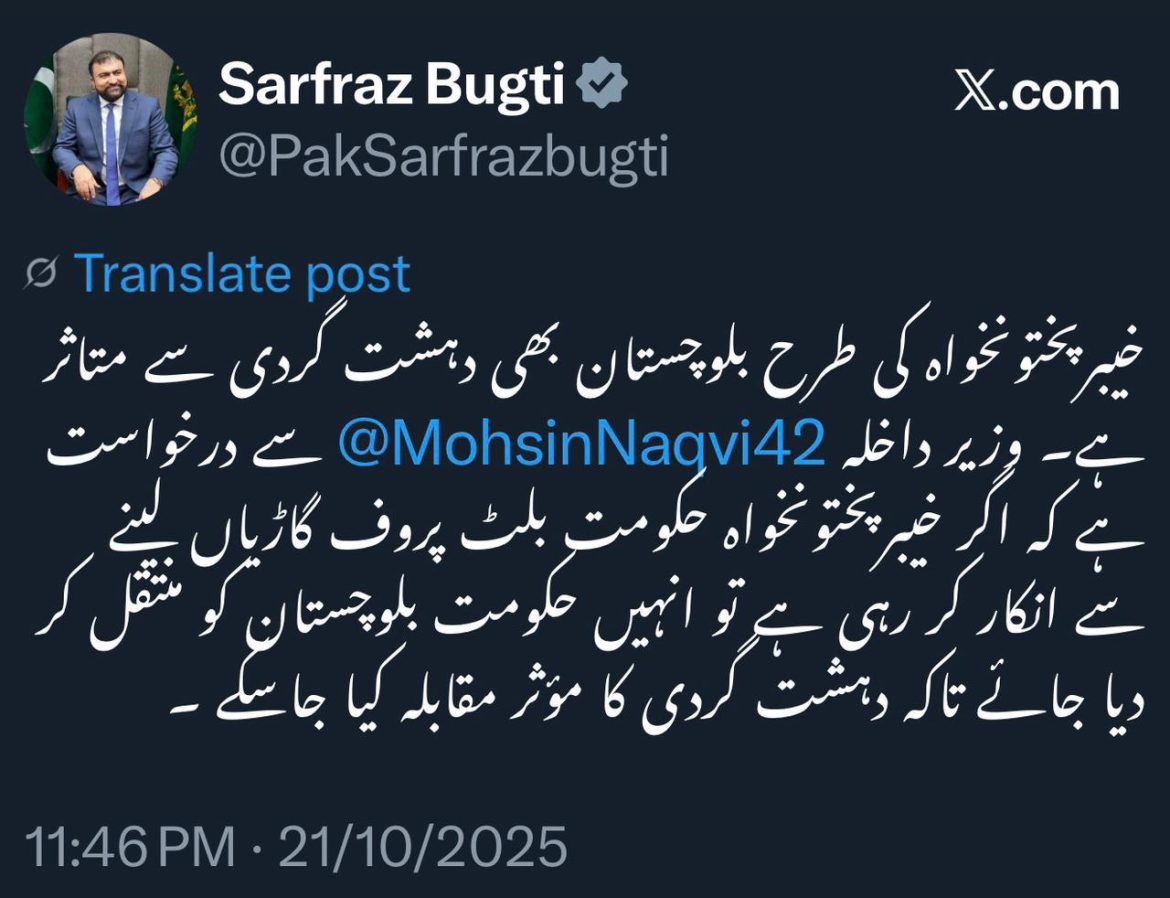 وزیر اعلیٰ نے وفاقی وزیر داخلہ سے درخواست کی ہے کہ اگر خیبر پختونخوا حکومت بلٹ پروف گاڑیاں لینے سے انکار کر رہی ہے تو یہ گاڑیاں بلوچستان کو فراہم کی جائیں تاکہ صوبے میں سیکیورٹی ادارے دہشت گردی کے خلاف مؤثر کارروائیاں جاری رکھ سکیں۔