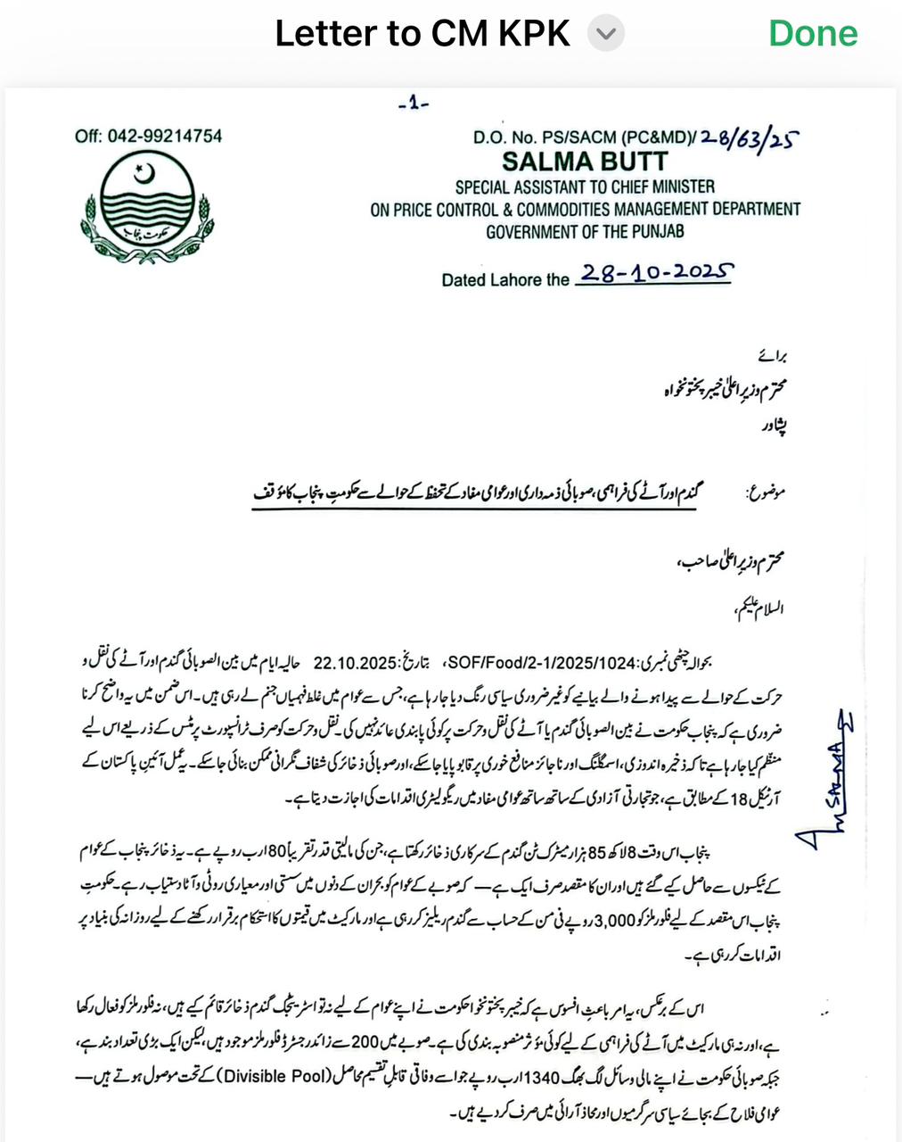 یہ خط وزیراعلیٰ پنجاب کی معاون خصوصی سلمیٰ بٹ کی جانب سے تحریر کیا گیا ہے، جس میں پنجاب حکومت نے گندم اور آٹے کی نقل و حرکت سے متعلق حقائق واضح کیے ہیں۔