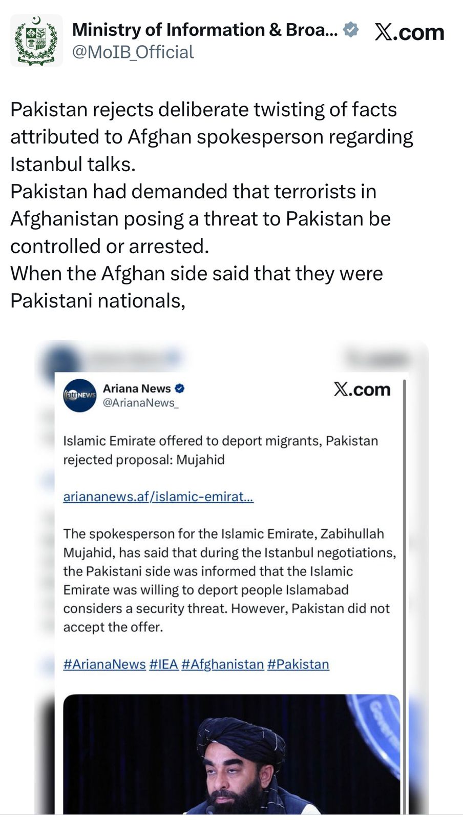 ترجمان وزارتِ اطلاعات کے مطابق، ذبیح اللہ مجاہد نے استنبول میں ہونے والے مذاکرات کے حوالے سے جو مؤقف پیش کیا، وہ گمراہ کن اور حقائق سے ہٹ کر ہے۔