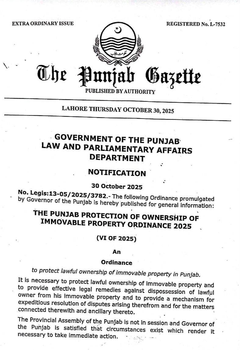 لاہور: پنجاب حکومت نے صوبے بھر میں قبضہ مافیا، جعلسازوں اور سہولت کاروں کے خلاف سخت قانونی کارروائی کے لیے نیا قانون “پنجاب پروٹیکشن آف اونرشپ آف امووایبل پراپرٹی آرڈیننس 2025” تیار کر لیا ہے۔