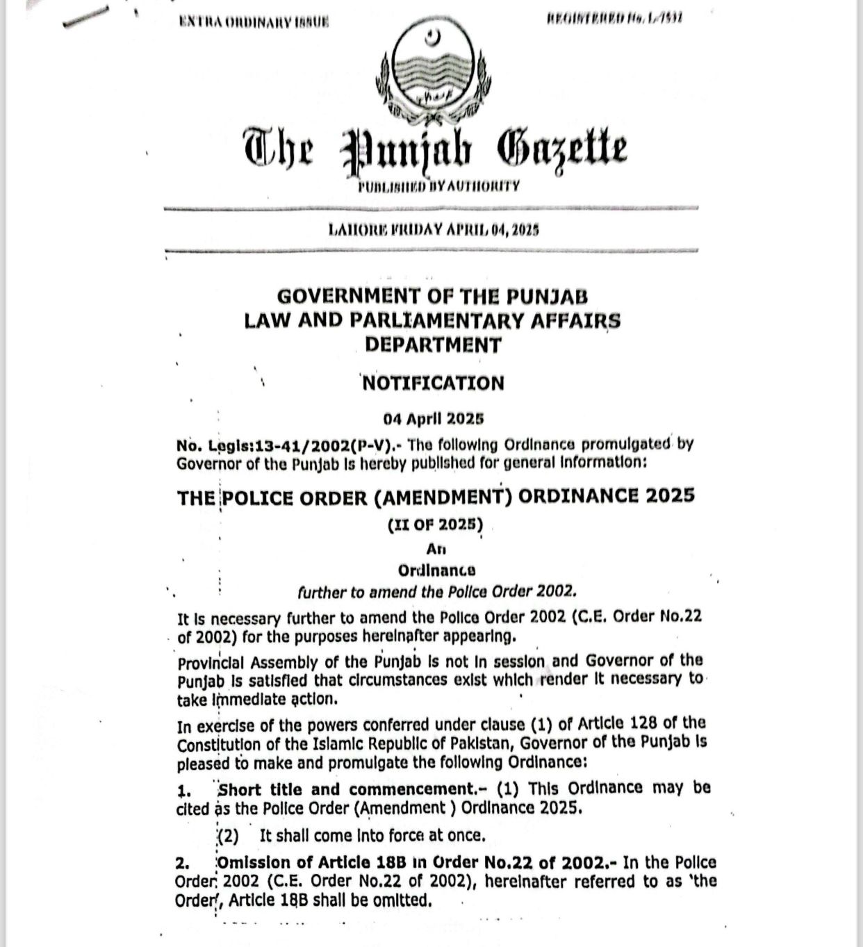حکومت پنجاب دی پولیس آرڈر (ترمیم) آرڈیننس 2025 کو باضابطہ قانون کی شکل دینے کے لیے بل آج پنجاب اسمبلی میں پیش کرے گی،بل پیش ہونے کے بعد قائمہ کمیٹی برائے داخلہ کے حوالے کیا جائے گا،کمیٹی دو ماہ تک ایوان میں رپورٹ پیش کرے گی،بعد از کمیٹی رپورٹ، آرڈیننس پنجاب اسمبلی سے بذریعہ رائے منظور کروایا جائے گا،اسمبلی اجلاس نا ہونے کی باعث بذریعہ گورنر آرڈیننس چار ماہ کے لئے ڈیپارٹمنٹ قائم کرنے کی اجازت ملی تھی،گورنر پنجاب نے 4 اپریل کو پولیس آرڈر 2002 میں ترمیم کی اجازت دی،کرائم کنٹرول ڈیپارٹمنٹ گورنر آرڈیننس کے ذریعے اپنا کام کر رہا ہے،بل کے متن میں کہا گیا ہے کہ کرائم کنٹرول ڈیپارٹمنٹ فورتھ شیڈول جرائم دیکھے گا، آرڈیننس کا کرائم کنٹرول فورس کے نام سے سپیشل فورس تشکیل دی جائے گی،کرائم کنٹرول ڈیپارٹمنٹ کے سربراہ ایڈیشنل آئی جی پولیس ہوں گے۔