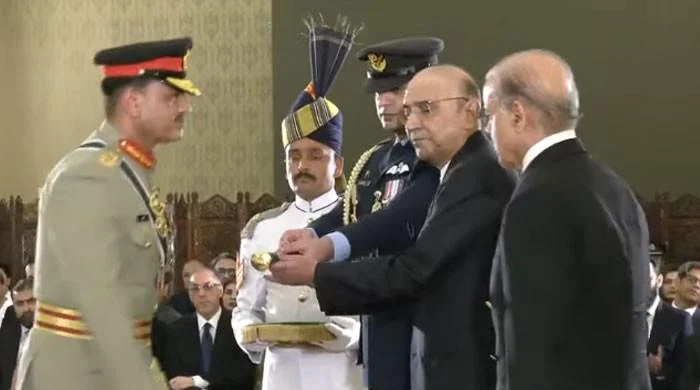 اسلام آباد: ایوان صدر میں ہونے والی تقریب میں صدر مملکت آصف علی زرداری اور وزیراعظم شہباز شریف نے آرمی چیف سید عاصم منیر کو بیٹن آف فیلڈ مارشل سے نواز دیا۔