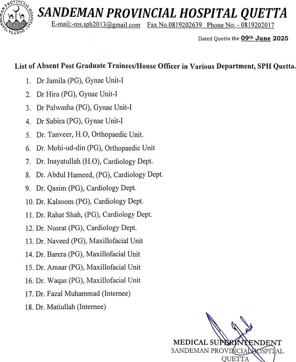 عید کے روز صوبائی وزیر صحت نے جہاں ذاتی طور پر اسپتالوں کے دورے کرکے فراہم کی جانے والی طبی سہولیات کا جائزہ لیا وہاں دوران فرائض سے غیر حاضری پر سخت محکمانہ کارروائی کا آغاز بھی کر دیا گیا ہے۔ سینڈمن صوبائی اسپتال کوئٹہ کی انتظامیہ نے بغیر اطلاع ڈیوٹی سے غیر حاضر 15 کنٹریکٹ نرسز کو فوری طور پر برطرف کر دیا، جب کہ 18 پوسٹ گریجویٹ ٹرینی ڈاکٹروں اور ہاؤس آفیسرز کے خلاف بھی تادیبی کارروائی کی جا رہی ہے اسپتال کے میڈیکل سپرنٹنڈنٹ کی جانب سے جاری نوٹیفکیشن کے مطابق برطرف کی گئی نرسز میں کبریٰ ستار، انوشہ امجد، حمیرہ اقبال، یاسمین، عارفہ، سجاد احمد، صبیحہ فقیر، ثمینہ محمد ہاشم، رمضان، لیلیٰ عبدالمتین، حق نواز، عبدالرشید، پروین غلام، شازیہ عالم اور کائنات اکبر شامل ہیں اسی طرح 7 اور 8 جون کو بغیر اجازت غیر حاضر رہنے والے 18 پی جی اور ہاؤس آفیسرز کے خلاف بھی کارروائی کے احکامات جاری کر دیے گئے ہیں۔ ان کے وظیفے فوری طور پر بند کرنے کی ہدایت کی گئی ہے۔ ان ڈاکٹروں میں ڈاکٹر جمیلہ، ڈاکٹر حرا، ڈاکٹر پلوشہ، ڈاکٹر صابرہ، ڈاکٹر تنویر، ڈاکٹر محی الدین، ڈاکٹر عنایت اللہ، ڈاکٹر عبد الحمید، ڈاکٹر قاسم، ڈاکٹر کلثوم، ڈاکٹر راحت شاہ، ڈاکٹر نصرت، ڈاکٹر نوید، ڈاکٹر برارہ، ڈاکٹر اماع، ڈاکٹر وقاص، ڈاکٹر فضل محمد اور ڈاکٹر مطیع اللہ شامل ہیں وزیر صحت بخت محمد کاکڑ نے اس حوالے سے واضح کیا ہے کہ "غیر حاضری کسی صورت برداشت نہیں کی جائے گی، مریضوں کی دیکھ بھال میں غفلت قابل معافی نہیں۔” ان کا کہنا تھا کہ اسپتالوں میں نظم و ضبط اور پیشہ ورانہ معیار کو برقرار رکھنا اولین ترجیح ہے تاکہ عوام کو بروقت اور مؤثر طبی سہولیات میسر آئیں۔