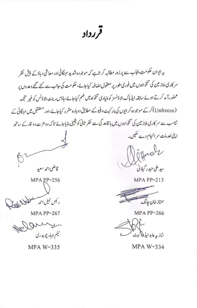 یہ ایوان حکومت پنجاب سے پر زور مطالبہ کرتا ہے کہ موجودہ شدید مہنگائی اور معاشی دباؤ کے پیش نظر سرکاری ملازمین کی تنخواہوں میں فوری طور پر معقول اضافہ کیا جائے، متن