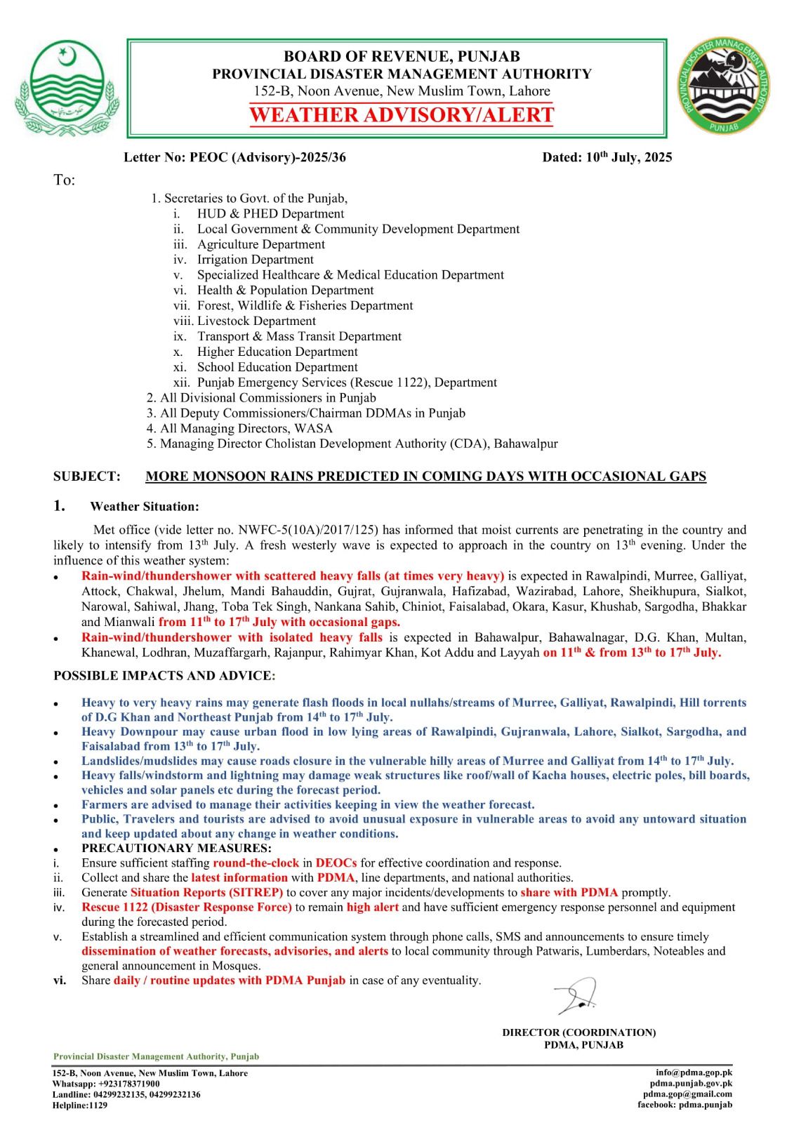 11 سے 17 جولائی کے دوران پنجاب کے بیشتر اضلاع میں تیز آندھی، اور بارش کی پیشگوئی ہے۔ راولپنڈی مری گلیات اٹک چکوال جہلم منڈی بہاوالدین گوجرانولہ حافظ آباد وزیر آباد میں بارشیں متوقع ہیں۔ لاہور شیخوپورہ سیالکوٹ نارووال ساہیوال جھنگ ٹوبہ ٹیک سنگھ ننکانہ چنیوٹ اور فیصل آباد میں بھی بارشیں ہوں گی۔ اوکاڑہ قصور خوشاب سرگودھا بھکر اور میانوالی میں گرج چمک کے ساتھ شدید بارشوں کی پیشگوئی ہے۔ 13سے 17 جولائی کے دوران بہاولپور بہاولنگر ڈی جی خان ملتان مظفرگڑھ خانیوال لودھراں راجن پور رحیم یار خان اور لیہ میں بھی گرج چمک کے ساتھ بارش کا امکان ہے۔ ڈی جی پی ڈی ایم اے عرفان علی کاٹھیا نے صوبہ بھر کے کمشنرز اور ڈپٹی کمشنرز کو الرٹ رہنے کی ہدایات جاری کیں۔ ڈائریکٹر جنرل پی ڈی ایم اے عرفان علی کاٹھیا کا کہنا تھا کہ وزیر اعلی پنجاب کی ہدایت کے مطابق ضلعی انتظامیہ کو الرٹ جاری کر دیا ہے۔ مون سون بارشوں سے پنجاب کے دریاؤں اور ان سے ملحقہ ندی نالوں میں پانی میں اضافے کے خدشات ہیں۔ برساتی نالوں میں فلیش فلڈنگ کا خطرہ ہے۔ بڑے شہروں میں مون سون بارشوں کے باعث اربن فلڈنگ کے پیش نظر انتظامیہ پیشگی الرٹ رہے۔ محکمہ صحت آبپاشی تعمیر و مواصلات لوکل گورنمنٹ اور لایئو سٹاک کو الرٹ جاری کر دیاگیا ہے۔ شہریوں سے التماس ہے کہ خراب موسم کی صورتحال میں احتیاطی تدابیر اختیار کر یں۔ آندھی و طوفان کی صورتحال میں محفوظ مقامات پر رہیں غیر ضروری سفر سے گریز کریں۔ شہری آسمانی بجلی سے تحفظ کیلئے محفوظ مقامات پر رہیں۔ بچوں کا خاص خیال رکھیں انہیں نشیبی علاقوں میں پانی اور بجلی تاروں و کھمبوں کے قریب ہرگز نہ جانے دیں۔ عوام الناس بجلی کی گرج چمک اور طوفانی صورتحال میں کھلے آسمان تلے ہرگز نہ جائیں۔ ایمرجنسی صورتحال میں پی ڈی ایم اے ہیلپ لائن 1129 پر رابطہ کریں۔