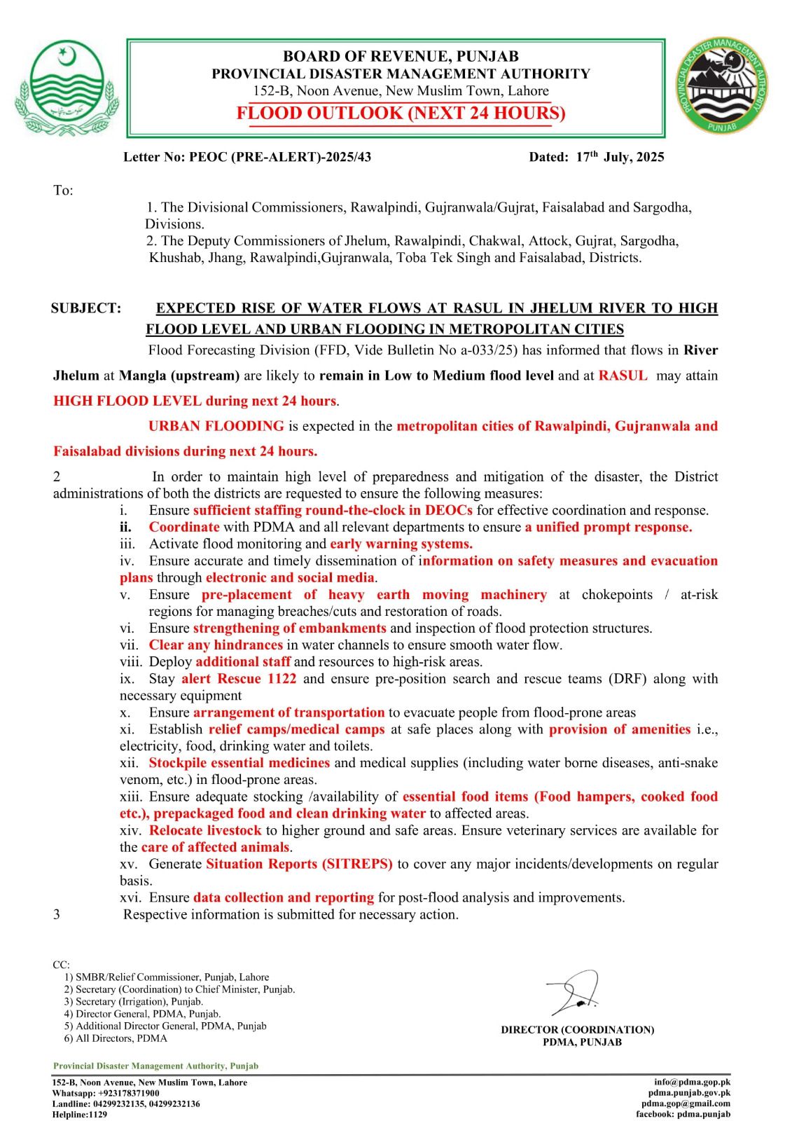 ترجمان پی ڈی ایم اے کا کہنا ہے کہ دریائے جہلم میں منگلا کے مقام پر نچلے سے درمیانے درجے کے سیلاب کا خدشہ ہے۔اگلے 24 گھنٹوں میں دریائے جہلم میں منگلا کے مقام پر سیلابی صورتحال بن سکتی ہے۔کمشنر راولپنڈی، گجرانوالہ، فیصل آباد اور کمشنر سرگودھا کو ممکنہ صورتحال بارے الرٹ جاری ہےجہلم، راولپنڈی، اٹک، گجرات، سرگودھا، خوشاب، جھنگ، راولپنڈی، گجرانوالہ، ٹوبہ ٹیک سنگھ اور فیصل آباد کے ڈپٹی کمشنرز کو الرٹ جاری کردیا گیا ہےپی ڈی ایم اے کی ریسکیو 1122 کو تمام تر انتظامات پیشگی مکمل کرنے کی ہدایات کی گئی ہے لوکل گورنمنٹ، محکمہ زراعت، محکمہ آبپاشی، محکمہ صحت، محکمہ جنگلات، لائیو اسٹاک اور محکمہ ٹرانسپورٹ کو الرٹ جاری کر دیا گیا ہے۔ڈی جی پی ڈی ایم اے عرفان کاٹھیا نے متعلقہ انتظامیہ کو الرٹ رہنے کی ہدایات کی ہےوزیر اعلیٰ پنجاب کی ہدایات کے پیش نظر تمام تر انتظامات پیشگی مکمل کریں ایمرجنسی کنٹرول رومز میں سٹاف کو الرٹ رکھا جائے۔ ریسکیو 1122 کی ڈائزاسٹر رسپانس ٹیموں کو بھی ہائی الرٹ رکھا جائے۔ریسکیو آپریشن کے لیے پٹرول و ڈیزل کا اسٹاک وافر مقدار میں ہونا چاہیے۔عوام الناس کو موجودہ صورتحال سے لمحہ بہ لمحہ آگاہ رکھا جائے۔دریاؤں کے پاٹ میں موجود مکانوں اور مویشیوں کے انخلاء کو یقینی بنائیں۔فلڈ ریلیف کیمپس میں خوراک، پینے کے صاف پانی و دیگر سہولیات کی فراہمی کو یقینی بنایا جائے عوام جاری کردہ احتیاطی تدابیر پر عمل کریں۔ہنگامی انخلاء کی صورت میں انتظامیہ سے تعاون کریں حکومت پنجاب آپکا اور آپکے مال مویشیوں کا پوری طرح سے خیال رکھے گی۔