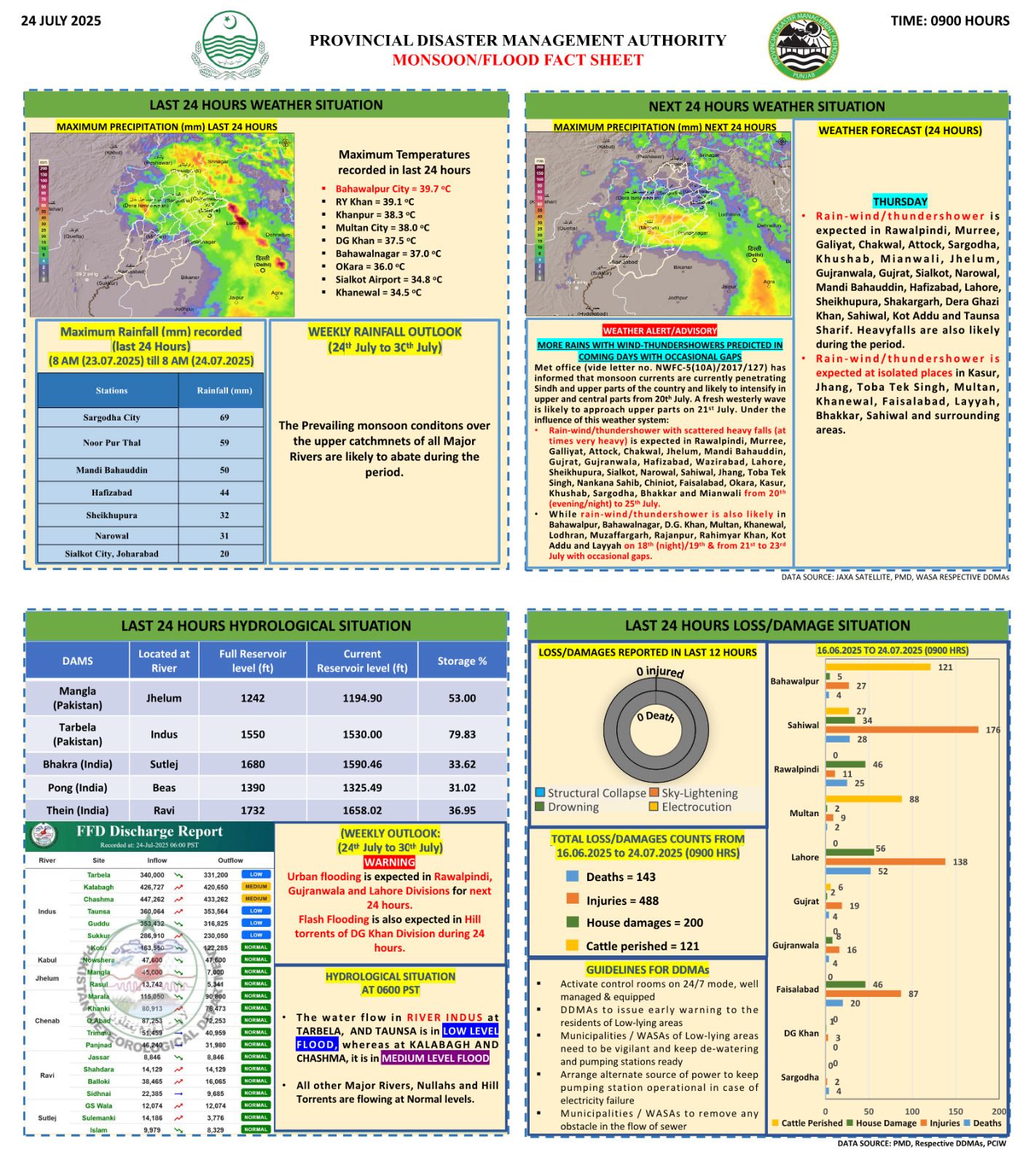 فیکٹ شیٹ میں مون سون بارشوں کی صورتحال، پنجاب کے دریاؤں، بیراجز اور ڈیمز میں پانی کی سطح بارے اعداد و شمار شامل ہیں مون سون بارشوں سے ہونے والے نقصانات بارے اعدادوشمار بھی فیکٹ شیٹ میں شامل ہیں ۔ترجمان پی ڈی ایم اے کے مطابق گزشتہ 24 گھنٹوں میں پنجاب کے بیشتر اضلاع میں مون سون بارشیں ریکارڈ کی گئیں ۔سرگودھا 69 ملی میٹر نورپور تھل 59 منڈی بہاوالدین 50 حافظ آباد 44 اور شیخوپورہ میں 32 ملی میٹر بارش ریکارڈ کی گئی ۔لاہور نارووال سیالکوٹ ٹوبہ ٹیک سنگھ اور ڈیرہ غازی خان میں بھی بارشیں ریکارڈ کی گئیں مون سون بارشوں کا چوتھا سلسلہ 25 جولائی تک جاری رہے گا۔آئندہ 24 گھنٹوں میں لاہور راولپنڈی سمیت پنجاب کے بیشتر اضلاع میں بارشوں کے امکانات ہیں۔مون سون بارشوں کے باعث پنجاب کے دریاؤں اور ندی نالوں میں طغیانی کا خدشہ ہے ۔وزیر اعلیٰ پنجاب کی ہدایات کے پیشِ نظر صوبے بھر کی انتظامیہ اور متعلقہ محکموں کو الرٹ جاری کر دیا گیا ہے ۔رپورٹ کے مطابق رواں سال مون سون بارشوں کے باعث 143 شہری جانبحق ہوئے 200 گھر متاثر اور 488 شہری زخمی ہوئے۔گزشتہ 24 گھنٹوں میں بارشوں کے باعث چھت گرنے سے 1 شہری جانبحق اور 3 زخمی ہوئے مون سون بارشوں کے باعث 121 مویشی ہلاک ہوئے۔اموات کچے مکانات،خستہ عمارتوں و چھتوں کے گرنے کے باعث ہوئیں آسمانی بجلی گرنے کرنٹ لگنے اور دریاؤں میں نہاتے ہوئے ڈوبنے سے بھی اموات رپورٹ ہوئیں۔ڈی جی پی ڈی ایم اے کا کہنا ہے کہ وزیر اعلیٰ پنجاب کی ہدایات کے پیشِ نظر سوگوار خاندانوں کی مالی معاونت یقینی بنائی جا رہی ہے ۔کسانوں کی فصلوں اور مویشیوں کے نقصانات کا بھی ازالہ کیا جائے گا منگلا ڈیم میں 53 فیصد جبکہ تربیلا میں 79 فیصد پانی موجود ہے۔انڈین ڈیمز میں پانی کی سطح تقریباً 36 تک فیصد ہے۔دریائے سندھ میں کالا باغ اور چشمہ کے مقام پر درمیانے درجے کا سیلاب ہے دریائے سندھ میں تربیلا اور تونسہ کے مقام پر نچلے درجے کی سیلابی صورتحال ہے۔دریائے چناب راوی جہلم اور ستلج میں پانی کا بہاؤ فی الحال نارمل سطح پر ہے۔ممکنہ سیلابی خطرے کے پیشِ نظر پی ڈی ایم اے کے انتظامات مکمل ہیں۔لاہور، سیالکوٹ،فیصل آباد اور گوجرانولہ میں مون سون بارشوں سےاربن فلڈنگ کا خدشہ ہے بڑے شہروں کی انتظامیہ ہنگامی صورتحال کے پیش نظر الرٹ رہے۔پی ڈی ایم اے کنٹرول روم اور ڈسٹرکٹ ایمرجنسی آپریشن سنٹرز 24/7 صورتحال کو مانیٹر کر رہے ہیں۔ڈی جی پی ڈی ایم اے نے مزید ممکنہ بارشوں کے پیش نظر واسا و انتظامیہ کو نشیبی علاقوں سے پانی کی نکاسی یقینی بنانے کی ہدایات