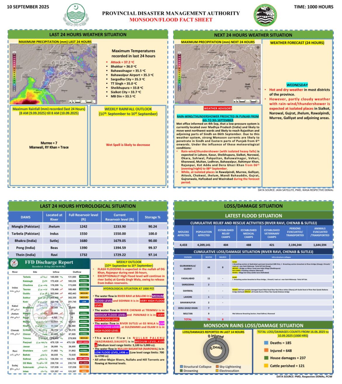 ریلیف کمشنر پنجاب نبیل جاوید کا کہنا ہے کہ دریائے راوی ستلج اور چناب میں شدید سیلابی صورتحال کے باعث 44 سو سے زائد موضع جات متاثر ہوئے۔دریائے چناب میں سیلاب کے باعث مجموعی طور پر 2190 موضع جات متاثر ہوئے۔دریائے ستلج میں سیلاب کے باعث 651 موضع جات متاثر ہوئے۔دریائے راوی میں سیلاب کے باعث مجموعی طور پر 1495 موضع جات متاثر ہوئے۔دریاؤں میں سیلابی صورتحال کے باعث مجموعی طور پر 42 لاکھ 9 ہزار لوگ متاثر ہوئے۔سیلاب میں پھنس جانے والے 21 لاکھ 90 ہزار لوگوں کو محفوظ مقامات پر منتقل کیا گیا۔شدید سیلاب سے متاثرہ اضلاع میں 404 ریلیف کیمپس قائم کیے گئے ہیں۔ سیلاب سے متاثر ہونے والے اضلاع میں 488 میڈیکل کیمپس بھی قائم کیے گئے ہیں۔مویشیوں کو علاج معالجے کی سہولت فراہم کرنے کے لیے 421 ویٹرنری کیمپس قائم کیے گئے ہیں۔متاثرہ اضلاع میں ریسکیو وہ ریلیف سرگرمیوں میں 15 لاکھ 81 ہزار جانوروں کو محفوظ مقامات پر منتقل کیا گیا۔منگلا ڈیم 90 فیصد جبکہ تربیلا ڈیم 100 فیصد تک بھر چکا ہے۔دریائے ستلج پر موجود انڈین بھاکڑا ڈیم 90 فیصد تک بھر چکا ہے۔پونگ ڈیم 99 فیصد جبکہ تھین ڈیم 97 فیصد تک بھر چکا ہے۔حالیہ سیلاب میں مختلف حادثات میں 76 شہری جانبحق ہوئے۔وزیر اعلٰی پنجاب کی ہدایات کے پیش نظر شہریوں کے نقصانات کا ازالہ کیا جائے گا۔
