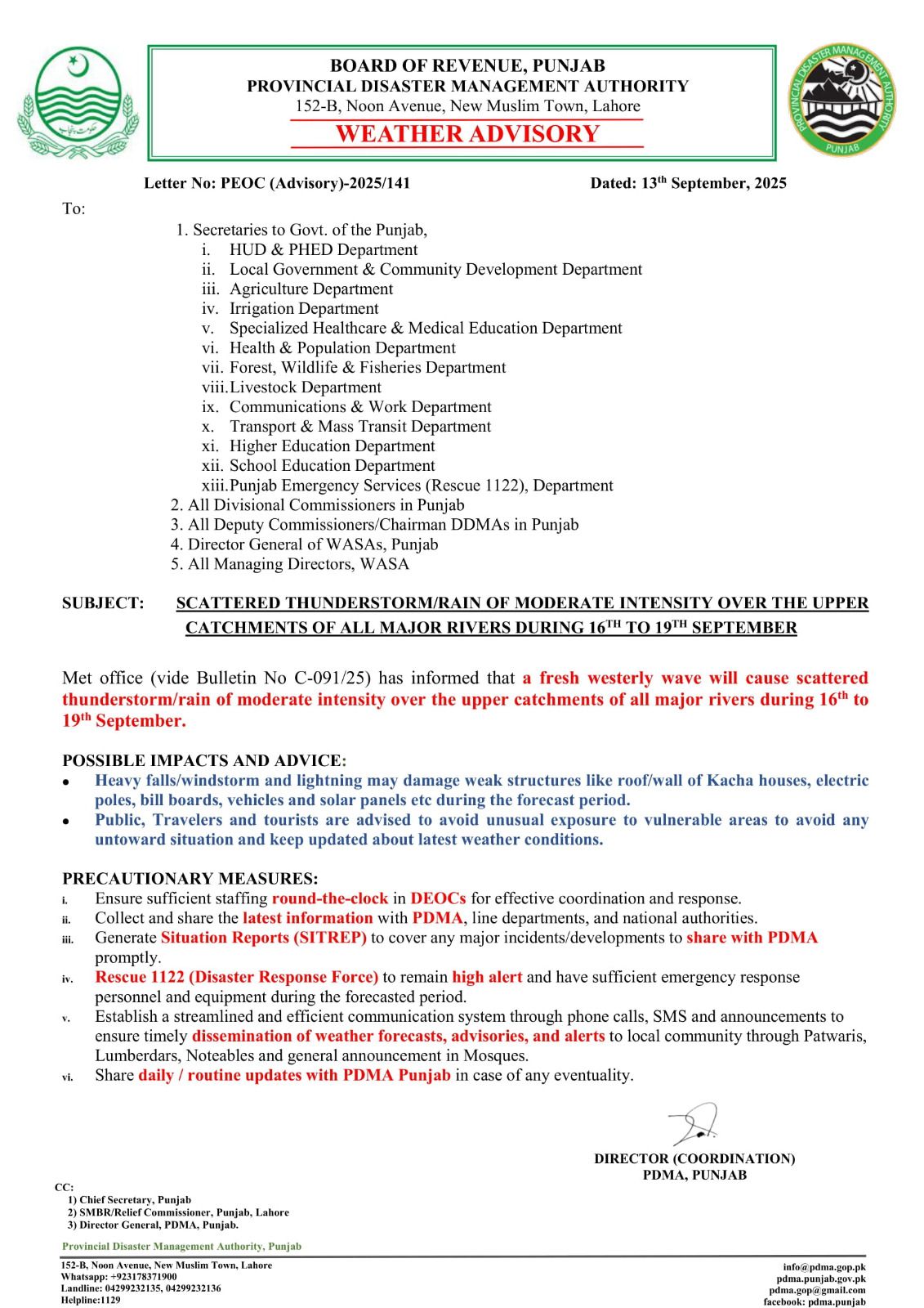 صفحہ اول موسم16سے 19 ستمبر تک دریاؤں کے بالائی علاقوں میں بارشوں کی پیشگوئی