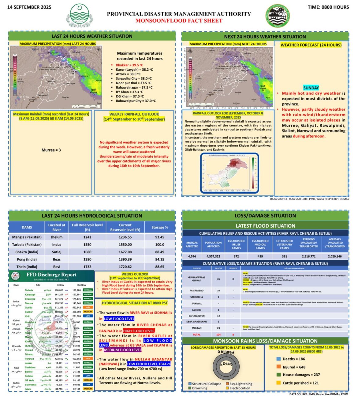 ریلیف کمشنر پنجاب کے مطابق دریائے راوی ستلج اور چناب میں شدید سیلابی صورتحال کے باعث 47سو سے زائد موضع جات متاثر ہو چکے ہیں دریائے چناب میں سیلاب کے باعث مجموعی طور پر 2475 موضع جات متاثر ہوئے۔ دریائے ستلج میں سیلاب کے باعث 715 موضع جات متاثر ہوئے۔دریائے راوی میں سیلاب کے باعث مجموعی طور پر 1458 موضع جات متاثر ہوئے۔دریاؤں میں سیلابی صورتحال کے باعث مجموعی طور پر 45 لاکھ 74 ہزار لوگ متاثر ہوئے۔سیلاب میں پھنس جانے والے 25 لاکھ 16 ہزار لوگوں کو محفوظ مقامات پر منتقل کیا گیا۔شدید سیلاب سے متاثرہ اضلاع میں 372 ریلیف کیمپس قائم کیے گئے ہیں۔سیلاب سے متاثر ہونے والے اضلاع میں 459 میڈیکل کیمپس بھی قائم کیے گئے ہیں۔مویشیوں کو علاج معالجے کی سہولت فراہم کرنے کے لیے 391 ویٹرنری کیمپس قائم کیے گئے ہیں۔متاثرہ اضلاع میں ریسکیو و ریلیف سرگرمیوں میں 20 لاکھ 20 ہزار جانوروں کو محفوظ مقامات پر منتقل کیا گیا۔منگلا ڈیم 93 فیصد جبکہ تربیلا ڈیم 100 فیصد تک بھر چکا ہے۔دریائے ستلج پر موجود انڈین بھاکڑا ڈیم 88 فیصد تک بھر چکا ہے۔پونگ ڈیم 94 فیصد جبکہ تھین ڈیم 88 فیصد تک بھر چکا ہے۔حالیہ سیلاب سے مختلف حادثات میں 104 شہری جانبحق ہوئےوزیر اعلٰی پنجاب کی ہدایات کے پیش نظر شہریوں کے نقصانات کا ازالہ کیا جائے گا۔