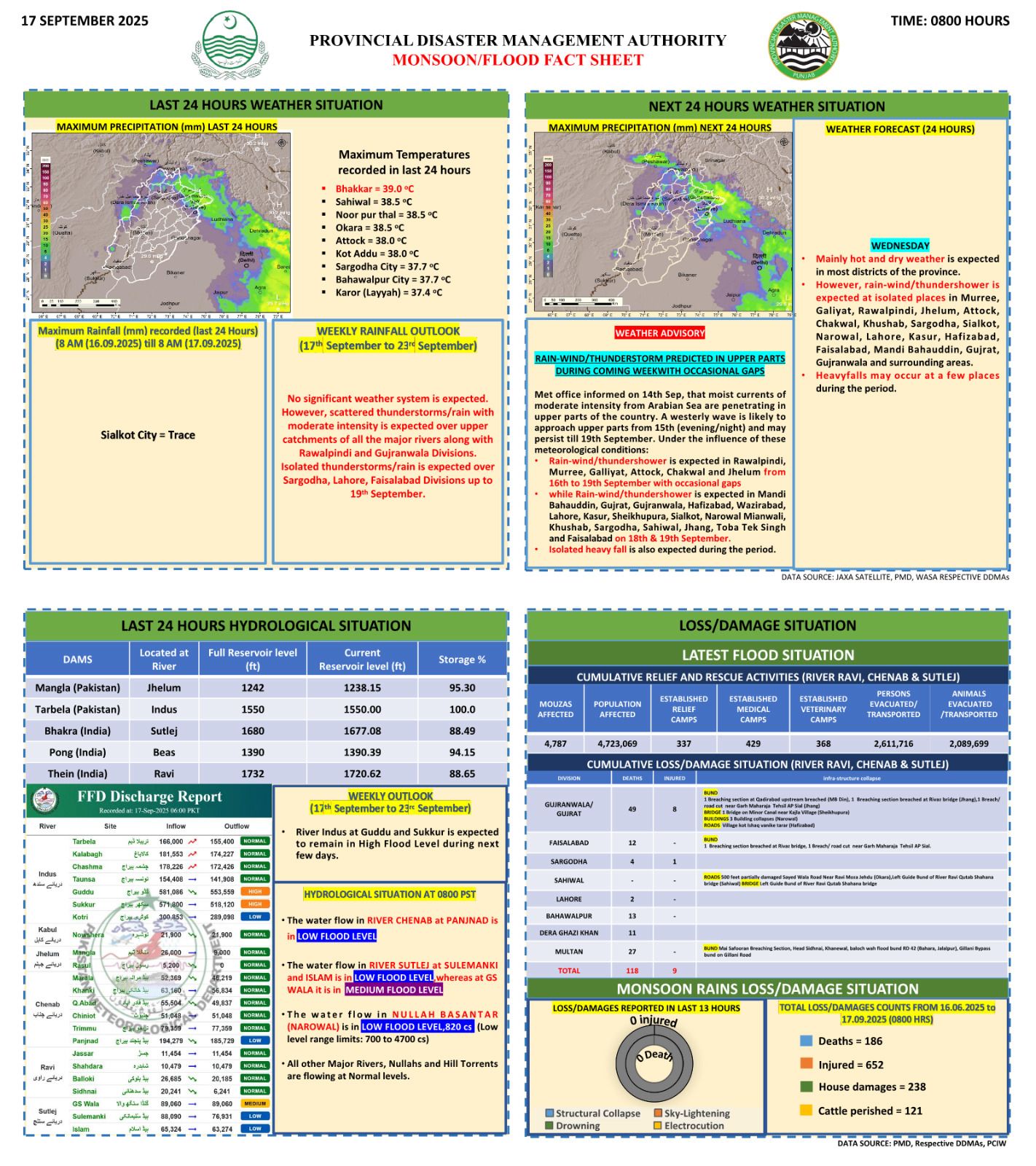 ریلیف کمشنر پنجاب کے مطابق دریائے راوی ستلج اور چناب میں شدید سیلابی صورتحال کے باعث 47سو سے زائد موضع جات متاثر ہو چکے ہیں ۔دریاؤں میں سیلابی صورتحال کے باعث مجموعی طور پر 47 لاکھ 23 ہزار لوگ متاثر ہوئے۔ شدید سیلاب سے متاثرہ اضلاع میں 337 ریلیف کیمپس قائم کیے گئے ہیں۔سیلاب سے متاثر ہونے والے اضلاع میں 429 میڈیکل کیمپس بھی قائم کیے گئے ہیں۔ سیلاب میں پھنس جانے والے 26 لاکھ 11 ہزار لوگوں کو محفوظ مقامات پر منتقل کیا گیا۔مویشیوں کو علاج معالجے کی سہولت فراہم کرنے کے لیے 368 ویٹرنری کیمپس قائم کیے گئے ہیں۔متاثرہ اضلاع میں ریسکیو و ریلیف سرگرمیوں میں 20 لاکھ 89 ہزار جانوروں کو محفوظ مقامات پر منتقل کیا گیا۔منگلا ڈیم 95 فیصد جبکہ تربیلا ڈیم 100 فیصد تک بھر چکا ہے۔دریائے ستلج پر موجود انڈین بھاکڑا ڈیم 88 فیصد تک بھر چکا ہے۔پونگ ڈیم 94 فیصد جبکہ تھین ڈیم 88 فیصد تک بھر چکا ہے۔حالیہ سیلاب سے مختلف حادثات میں 118 شہری جانبحق ہوئے۔وزیر اعلٰی پنجاب کی ہدایات کے پیش نظر شہریوں کے نقصانات کا ازالہ کیا جائے گا۔سیلاب کے باعث ہونے والے نقصانات کا تخمینہ لگانے کے لیے سروے کا جلد آغاز کر دیا جائے گا سروے مکمل ہونے پر شفافیت اور آسان طریقہ کار سے شہریوں کے نقصانات کا ازالہ کیا جائے گا۔