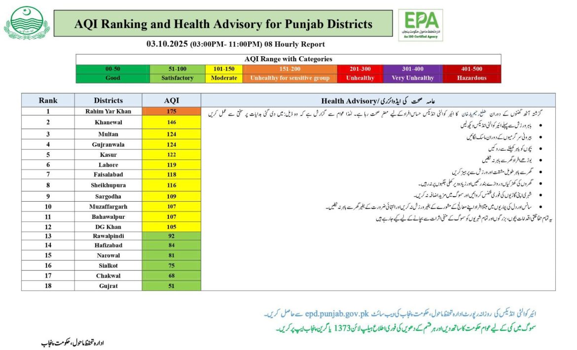 محکمہ تحفظِ ماحولیات کے مطابق پنجاب کے 18 اضلاع میں فضائی معیار کا پہلا روزانہ ڈیٹا جمع کیا گیا، جس میں مختلف شہروں کا ایئر کوالٹی انڈیکس (AQI) ریکارڈ کیا گیا ہے۔