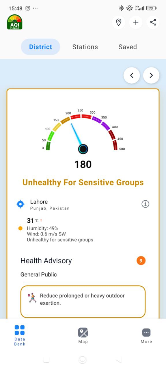 لاہور: شہر میں فضائی آلودگی کی شدت میں واضح کمی ریکارڈ کی گئی ہے۔ اسموگ نگرانی و پیشگی نظام کے مطابق لاہور کا ایئر کوالٹی انڈیکس (AQI) جو دن کے آغاز میں 350 تک پہنچ گیا تھا، وہ شام چار بجے تک کم ہو کر 180 پر آ گیا۔